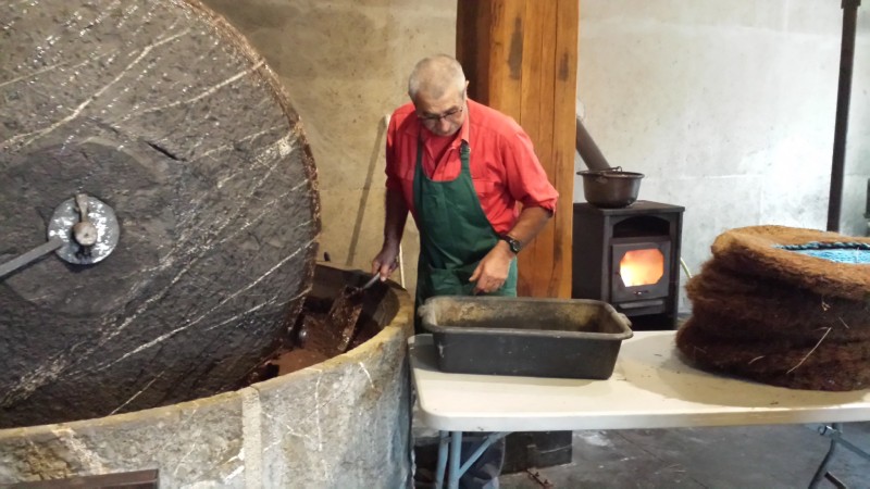 Nous assistons à la pressée à l’ancienne dans le moulin du XVIIIème siècle.  Celle-ci est effectuée par 2 membres d’une association de Puéchabon, amicale des anciens qui rénove les oliviers, fait tourner les moulins à l’ancienne et récolte l’huile bénévolement.