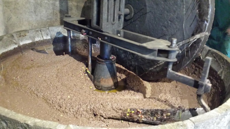 200 kg d’olives sont écrasés par la meule de pierre. Celle-ci est activée par une roue à eau extérieure (noria), alimentée par l’eau d’une source. Les olives écrasées sont ensuite placées à la main dans des galettes de paille et de chanvre : les scourtins « escourtins » en provencal ou cabas empilés les uns sur autres dans le pressoir. Les olives gardent leur noyau celui-ci contenant un conservateur naturel. Pour 100 kg d’olives ont obtient environ 12 litres d’huile. Le terroir influence son gout et sa couleur. La première pression se fait à froid, ce qu’il reste (« les grignions » ) est remis dans le bassin pour une deuxième pression , puis une troisième pression donne l’huile destinée aux savonneries ou aux lampes à huile.